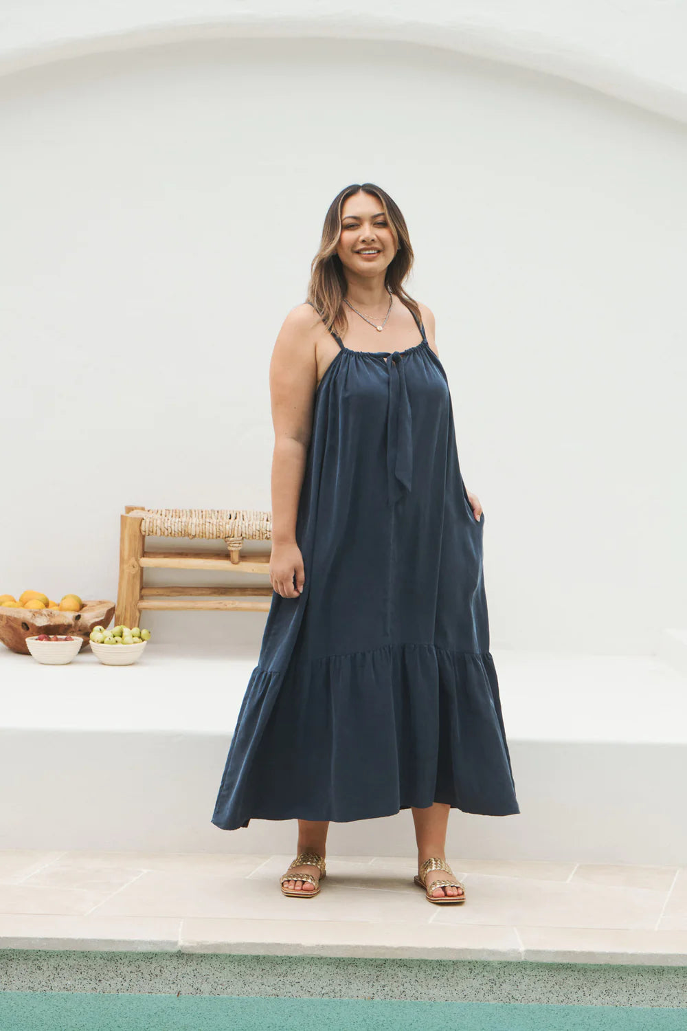 • Square neck with self-fabric tie