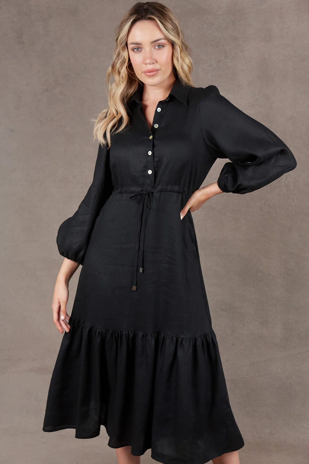 Indulge in the understated elegance of the 100% linen Nama Shirt Dress. With a classic collar, balloon sleeves, and a flowing tiered design, it exudes timeless charm. The waist drawstring creates a flattering cinched effect, making it suitable for any occasion, from casual outings to dressier affairs. Pair with boots and statement accessories for a fabulous look!