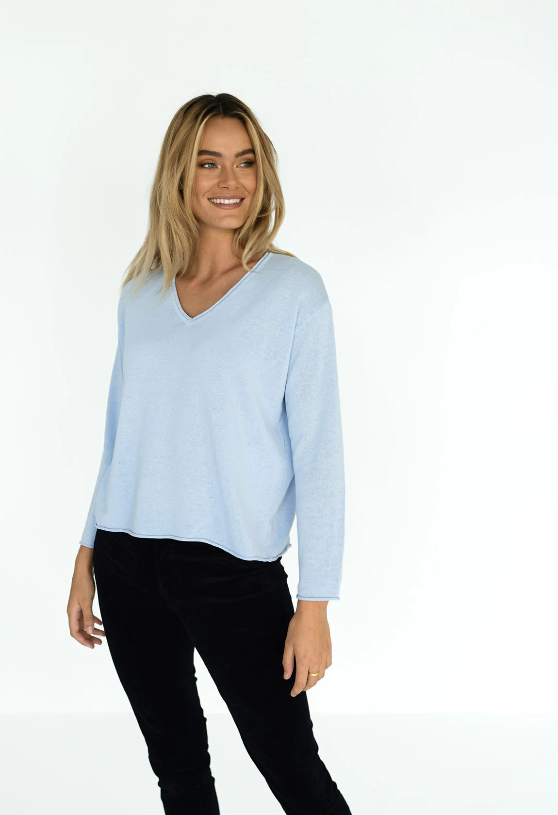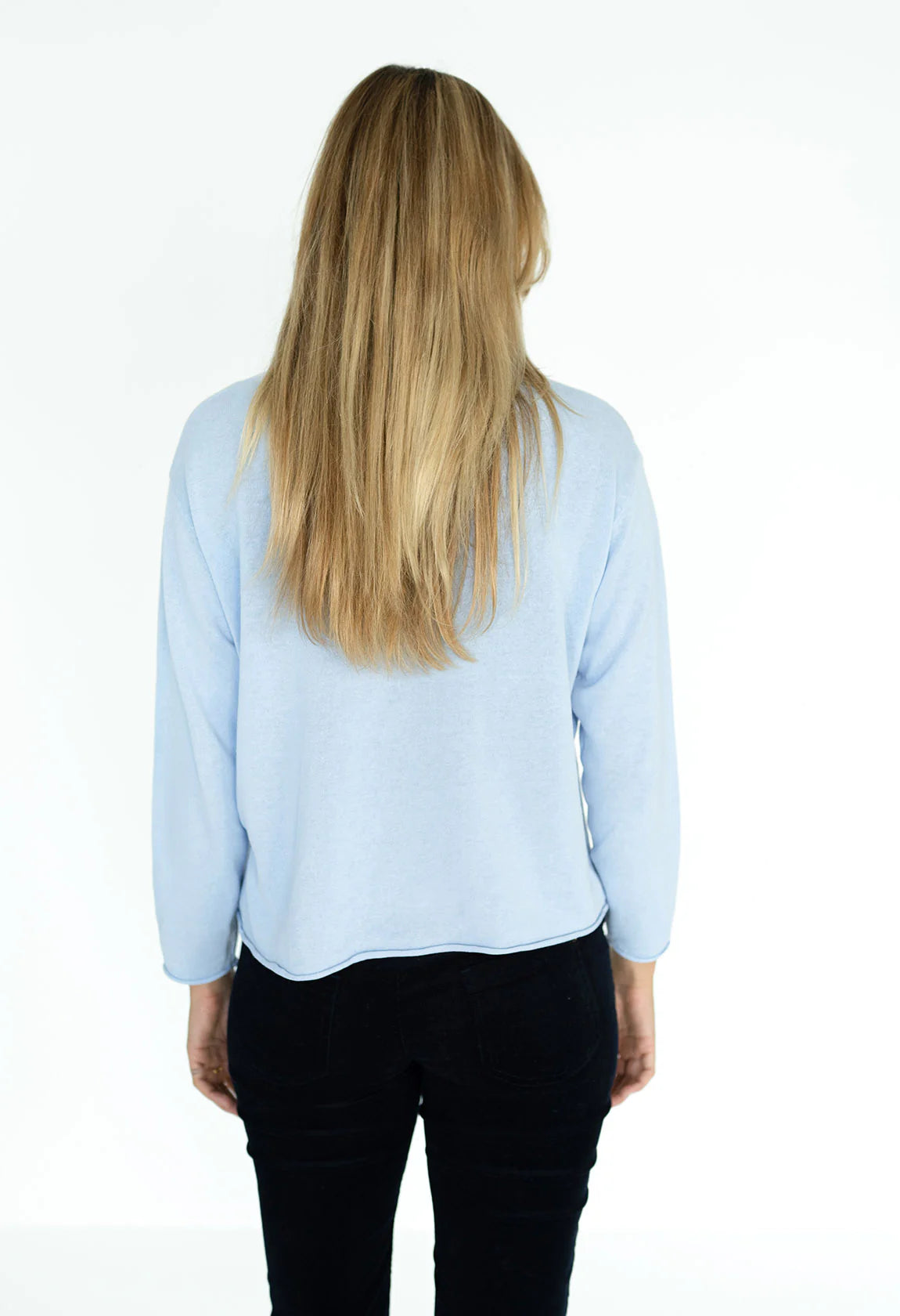 - Drop shoulder design with rolled detailing on neckline, hem, and sleeve