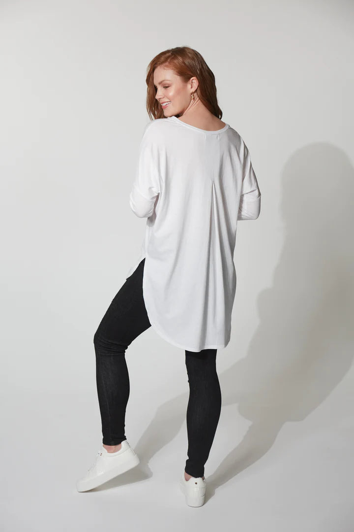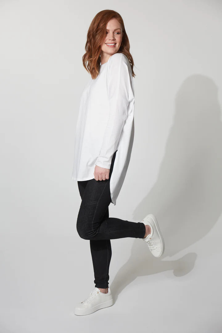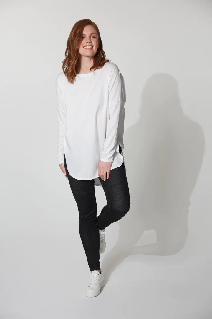 Meet the Tavani Tshirt, an everyday staple with timeless appeal. Versatile for solo wear or layering, it features a round neck, long sleeves, an inverted box pleat, and a curved high-low hem. This functional design effortlessly transcends seasons and trends. Create the perfect casual look by teaming it with your favourite denim, sneakers, and a stylish scarf.
