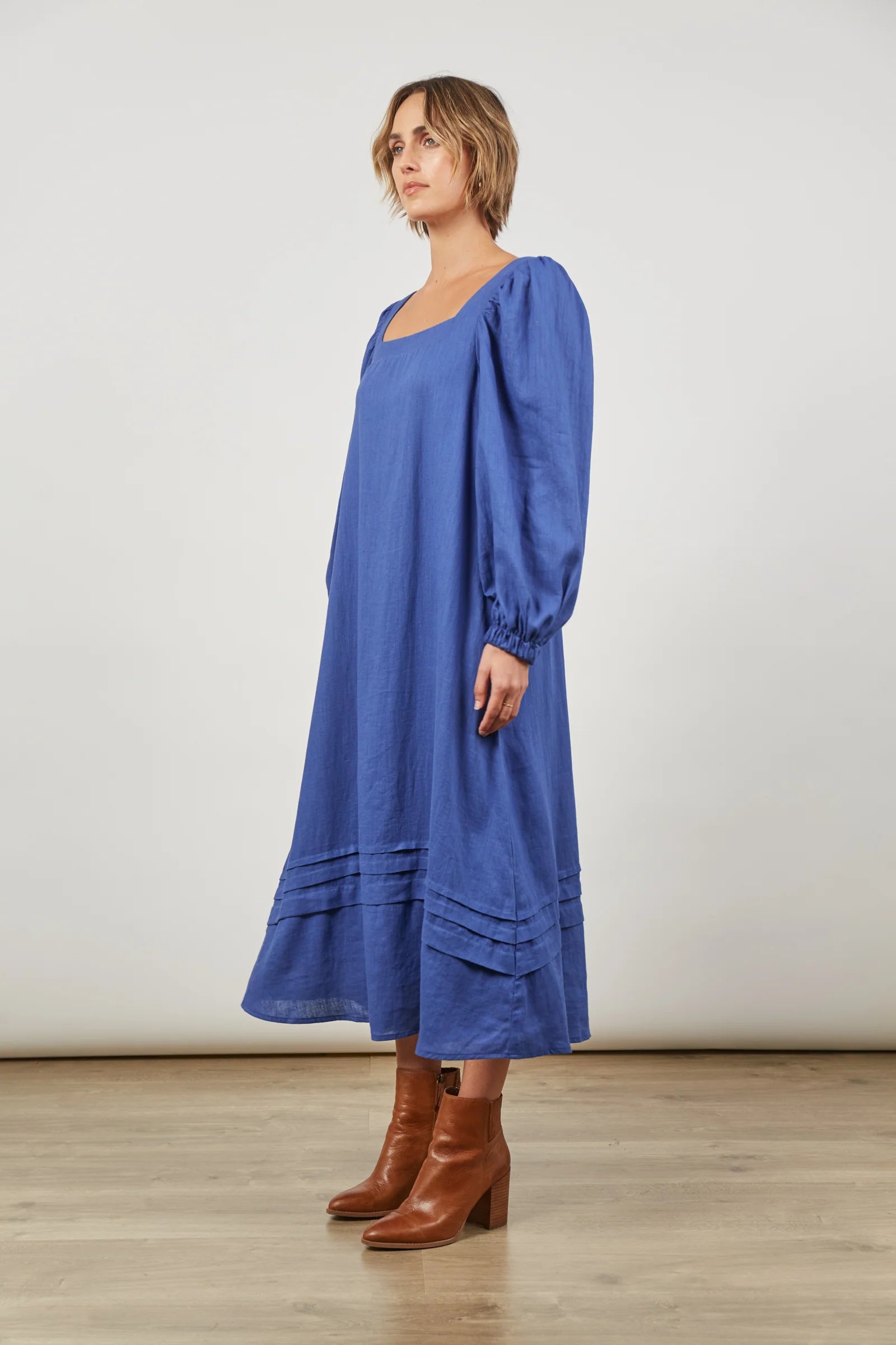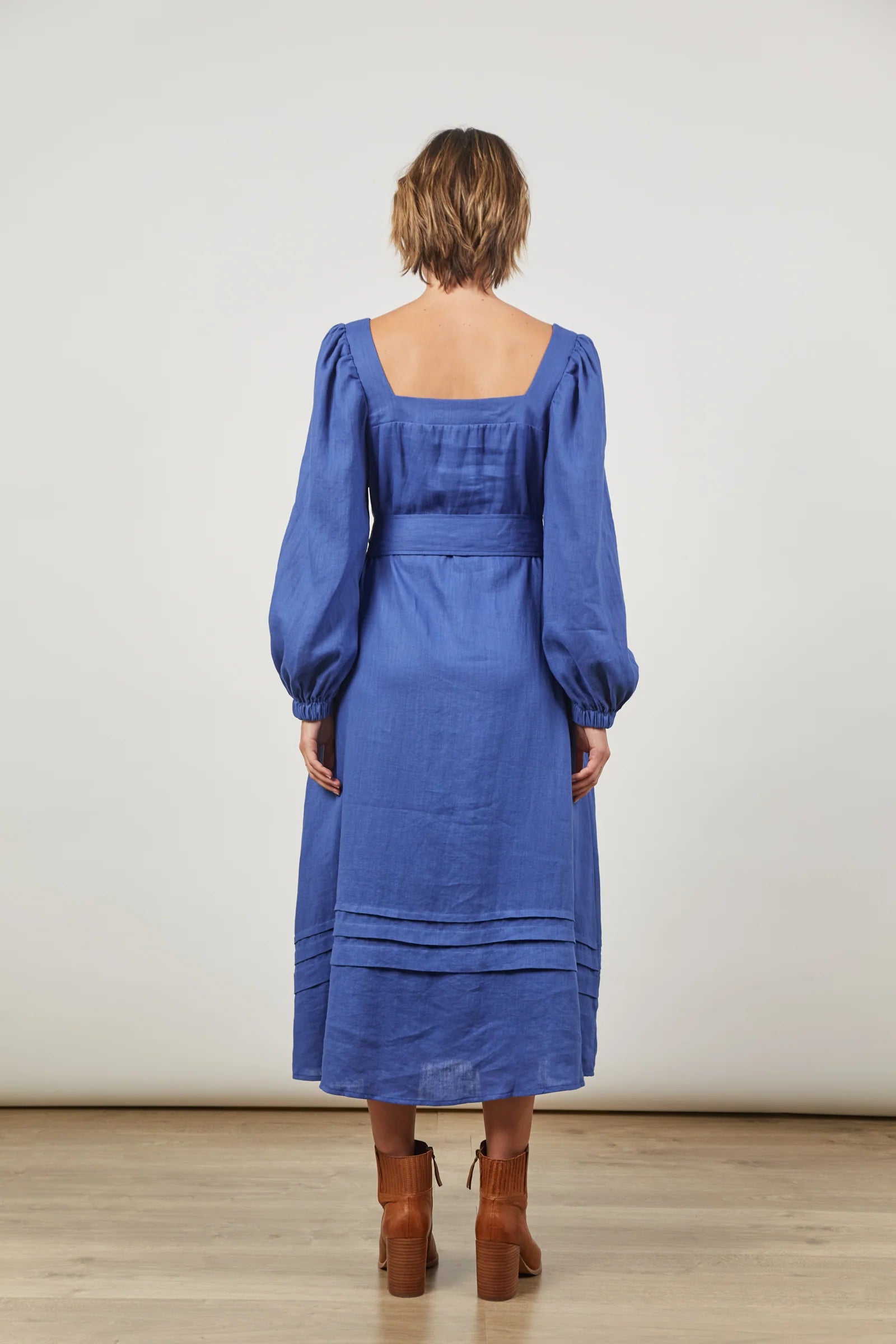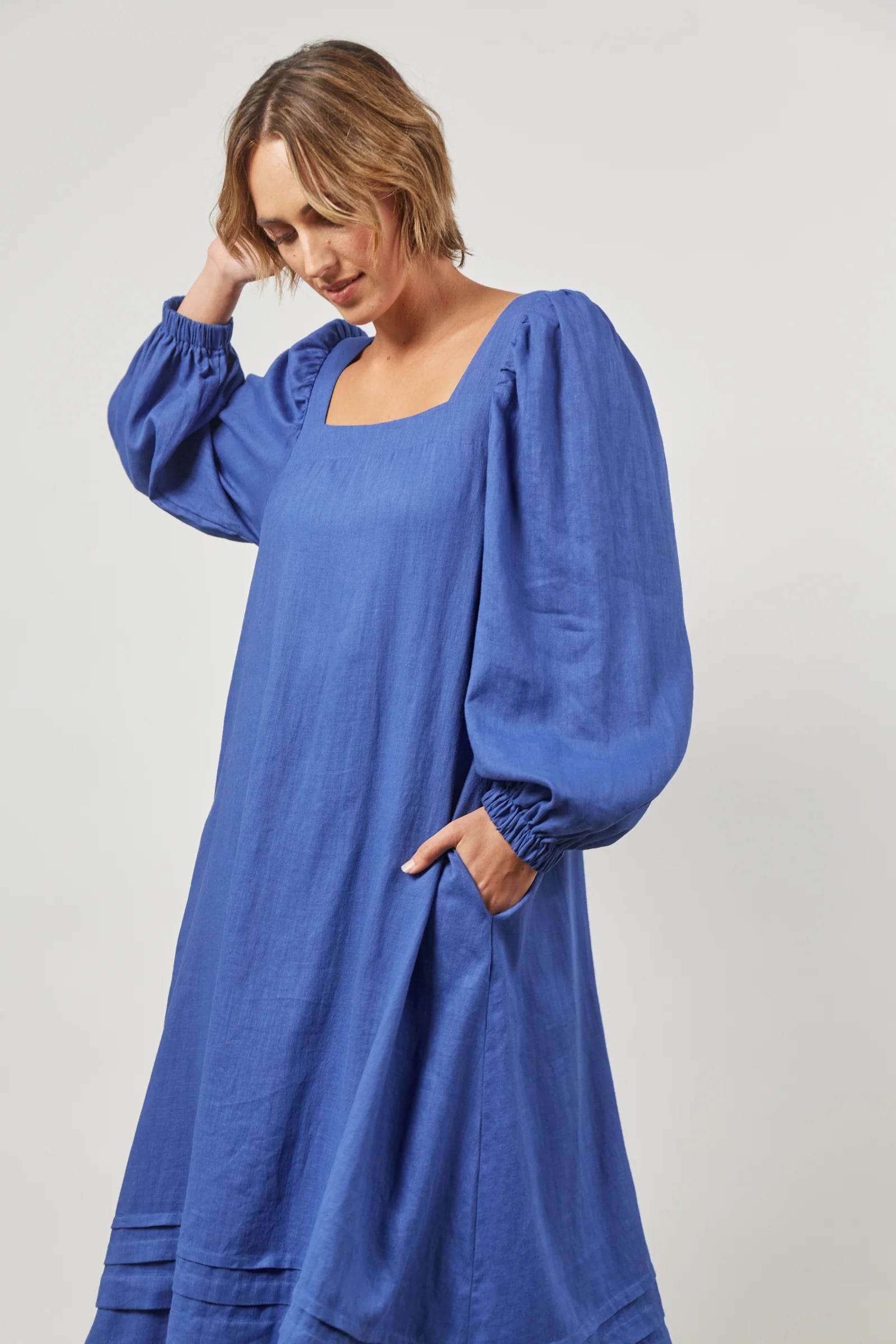 From birthday brunches to winery weekends, the Panorama Maxi has you covered. Crafted from a comfortable linen-cotton blend, it features a flattering square neckline and statement 3/4 balloon sleeves. With a silhouette that promises to flatter every body type, wear it freely for a relaxed look, or use the self-fabric belt to add definition to your waist.